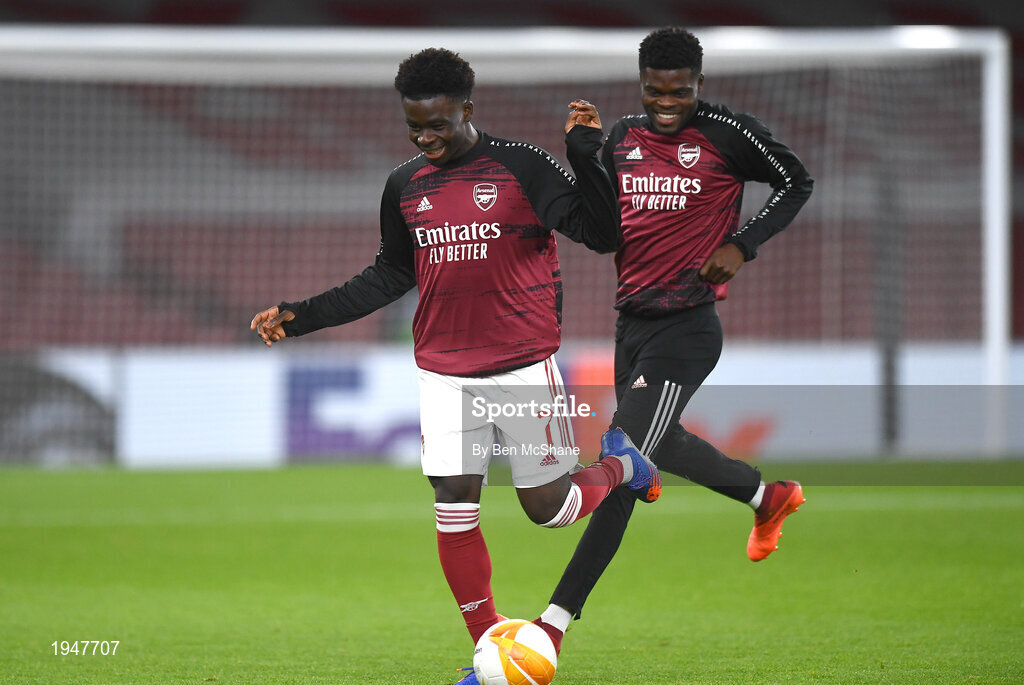 29 October 2020; Bukayo Saka, left, and Thomas Partey of Arsenal ahead of the UEFA Europa League Group B match between Arsenal and Dundalk at the Emirates Stadium in London, England. Photo by Ben McShane/Sportsfile