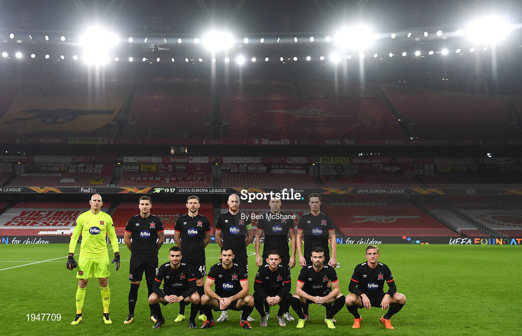 29 October 2020; The Dundalk team, top row, from left, Gary Rogers, Patrick McEleney, Andy Boyle, captain Chris Shields, Brian Gartland and Daniel Cleary. Bottom row, from left, Michael Duffy, Patrick Hoban, Sean Murray, Cameron Dummigan and John Mountney ahead of the UEFA Europa League Group B match between Arsenal and Dundalk at the Emirates Stadium in London, England. Photo by Ben McShane/Sportsfile
