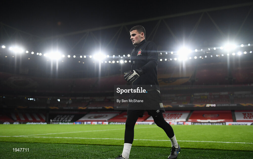29 October 2020; Jimmy Corcoran of Dundalk ahead of the UEFA Europa League Group B match between Arsenal and Dundalk at the Emirates Stadium in London, England. Photo by Ben McShane/Sportsfile