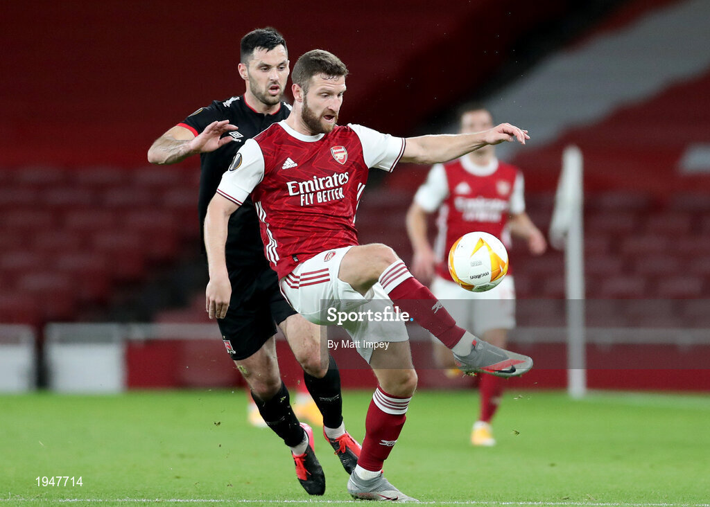 29 October 2020; Shkodran Mustafi of Arsenal in action against Patrick Hoban of Dundalk during the UEFA Europa League Group B match between Arsenal and Dundalk at the Emirates Stadium in London, England. Photo by Matt Impey/Sportsfile