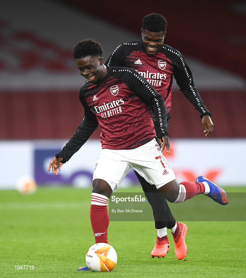 29 October 2020; Bukayo Saka, left, and Thomas Partey of Arsenal ahead of the UEFA Europa League Group B match between Arsenal and Dundalk at the Emirates Stadium in London, England. Photo by Ben McShane/Sportsfile