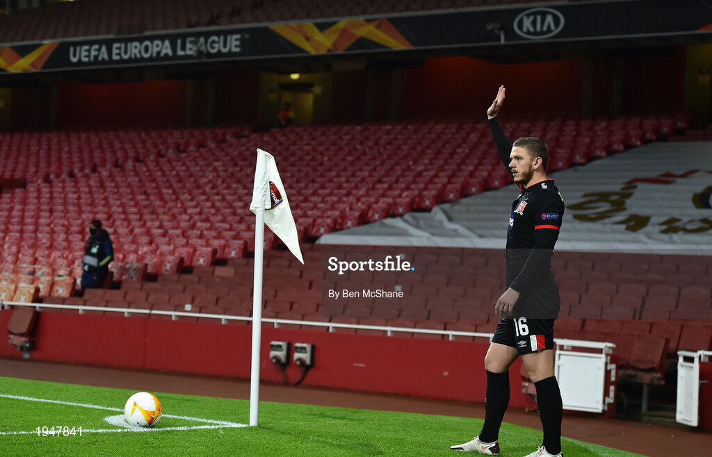 29 October 2020; Sean Murray of Dundalk prepares to deliver a corner kick during the UEFA Europa League Group B match between Arsenal and Dundalk at the Emirates Stadium in London, England. Photo by Ben McShane/Sportsfile