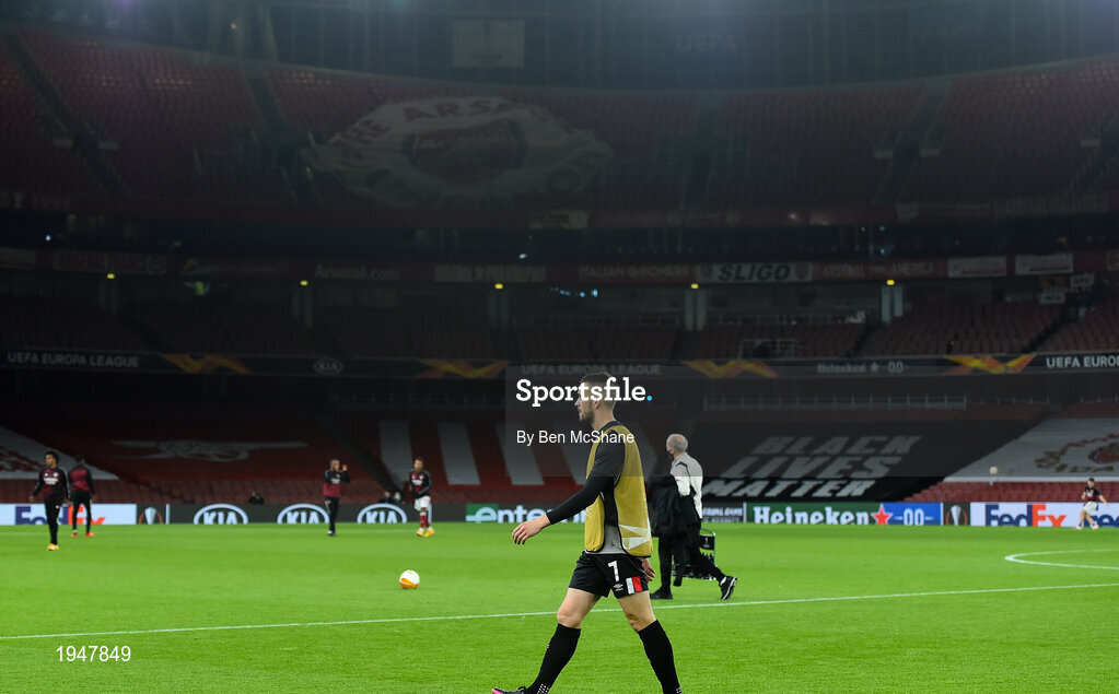 29 October 2020; Michael Duffy of Dundalk ahead of the UEFA Europa League Group B match between Arsenal and Dundalk at the Emirates Stadium in London, England. Photo by Ben McShane/Sportsfile