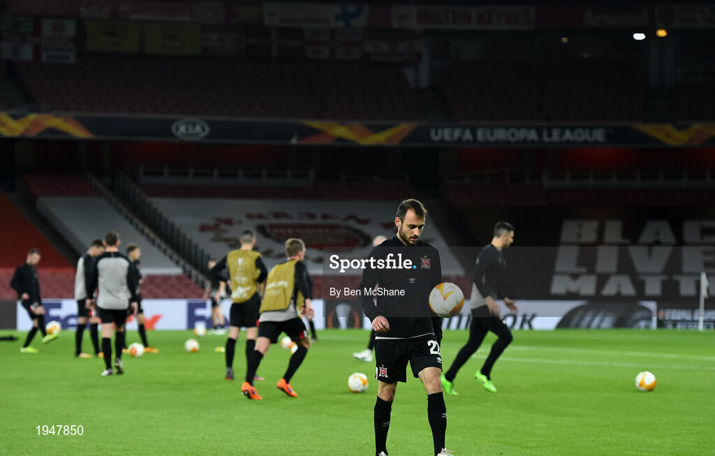 29 October 2020; Stefan Colovic of Dundalk ahead of the UEFA Europa League Group B match between Arsenal and Dundalk at the Emirates Stadium in London, England. Photo by Ben McShane/Sportsfile