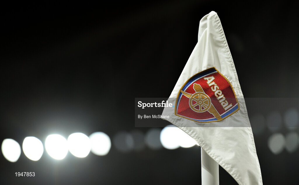29 October 2020; The Arsenal crest is seen on a corner flag ahead of the UEFA Europa League Group B match between Arsenal and Dundalk at the Emirates Stadium in London, England. Photo by Ben McShane/Sportsfile