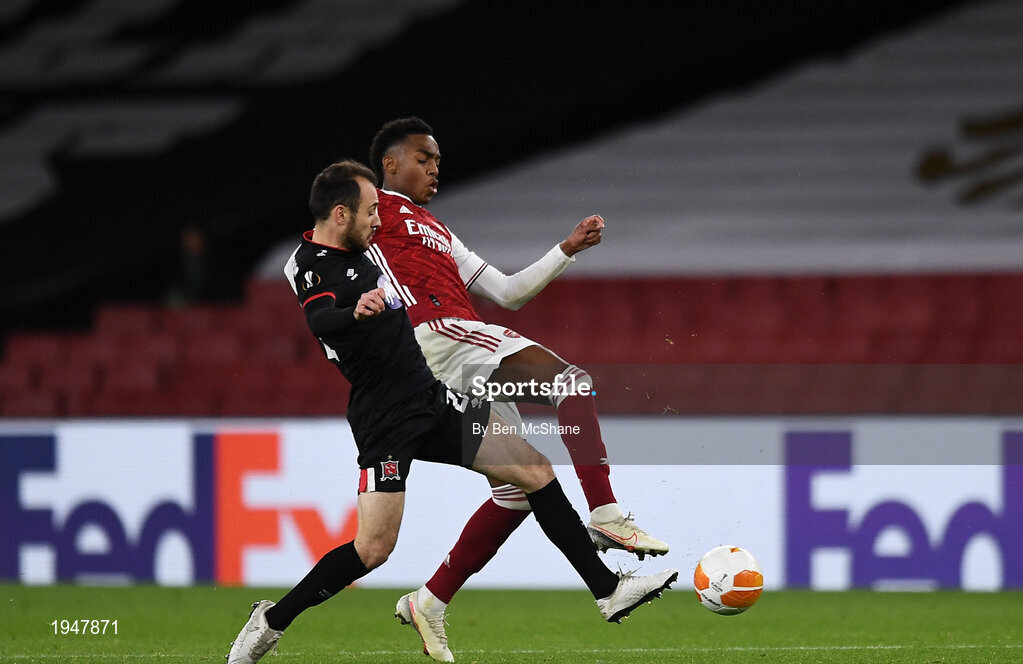 29 October 2020; Joe Willock of Arsenal and Stefan Colovic of Dundalk during the UEFA Europa League Group B match between Arsenal and Dundalk at the Emirates Stadium in London, England. Photo by Ben McShane/Sportsfile