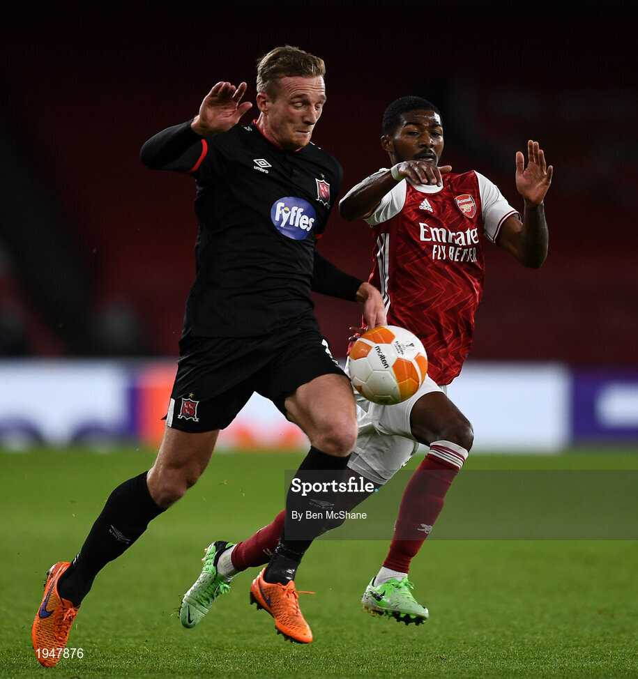 29 October 2020; John Mountney of Dundalk and Ainsley Maitland-Niles of Arsenal during the UEFA Europa League Group B match between Arsenal and Dundalk at the Emirates Stadium in London, England. Photo by Ben McShane/Sportsfile