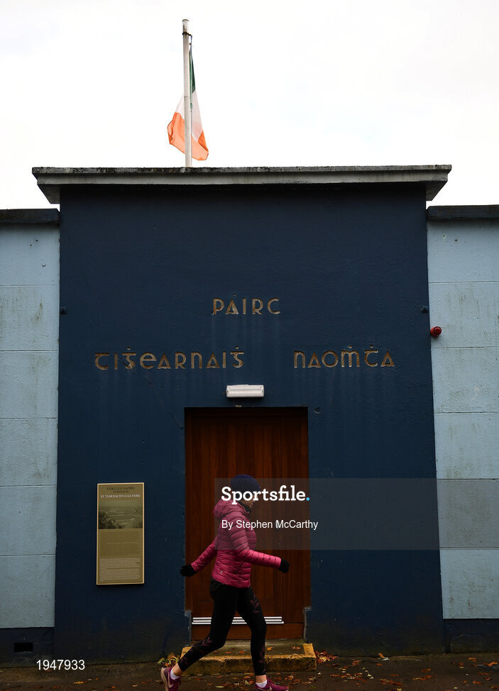 31 October 2020; A walker passes by St Tiernach’s Park prior to the Ulster GAA Football Senior Championship Preliminary Round match between Monaghan and Cavan at St Tiernach’s Park in Clones, Monaghan. Photo by Stephen McCarthy/Sportsfile