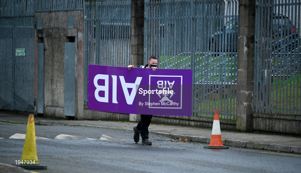 31 October 2020; An AIB sign is carried, by Shane Sterling, into the ground prior to the Ulster GAA Football Senior Championship Preliminary Round match between Monaghan and Cavan at St Tiernach’s Park in Clones, Monaghan. Photo by Stephen McCarthy/Sportsfile