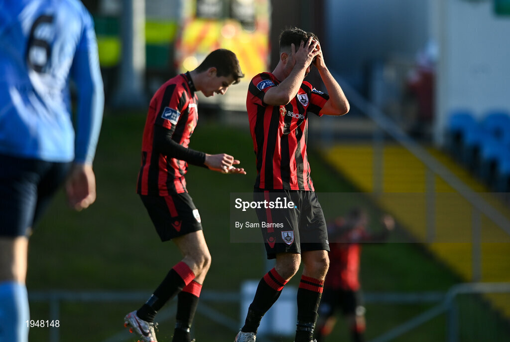 31 October 2020; Karl Chambers of Longford Town, right, reacts after a missed chance during the SSE Airtricity League First Division Play-off Semi-Final match between UCD and Longford Town at the UCD Bowl in Belfield, Dublin. Photo by Sam Barnes/Sportsfile