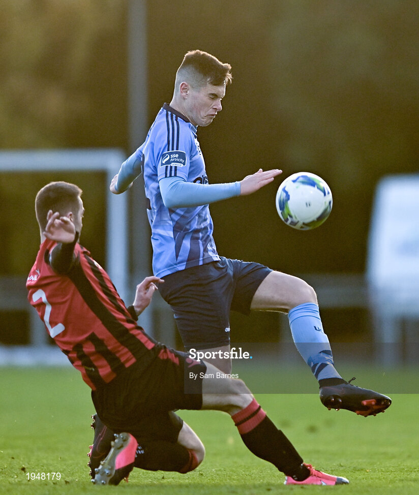 31 October 2020; Evan Weir of UCD is tackled by Shane Elworthy of Longford Town during the SSE Airtricity League First Division Play-off Semi-Final match between UCD and Longford Town at the UCD Bowl in Belfield, Dublin. Photo by Sam Barnes/Sportsfile