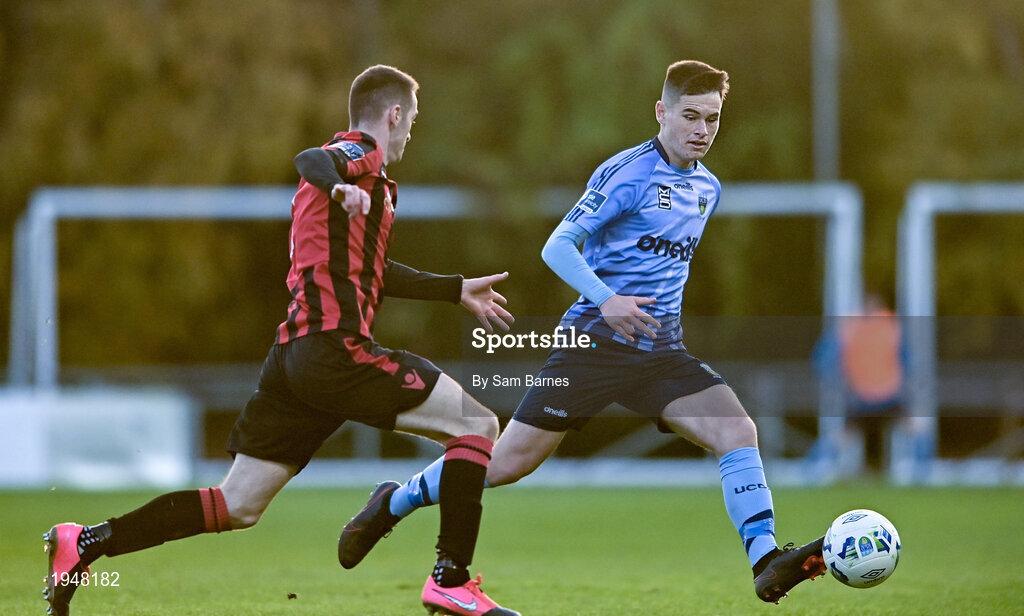 31 October 2020; Evan Weir of UCD in action against Shane Elworthy of Longford Town during the SSE Airtricity League First Division Play-off Semi-Final match between UCD and Longford Town at the UCD Bowl in Belfield, Dublin. Photo by Sam Barnes/Sportsfile