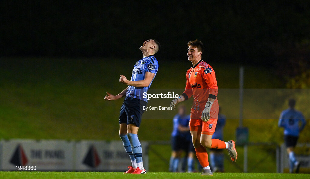 31 October 2020; Josh Collins, left, and Lorcan Healy of UCD celebrate after Yousef Mahdy of UCD scored his side's second goal during the SSE Airtricity League First Division Play-off Semi-Final match between UCD and Longford Town at the UCD Bowl in Belfield, Dublin. Photo by Sam Barnes/Sportsfile