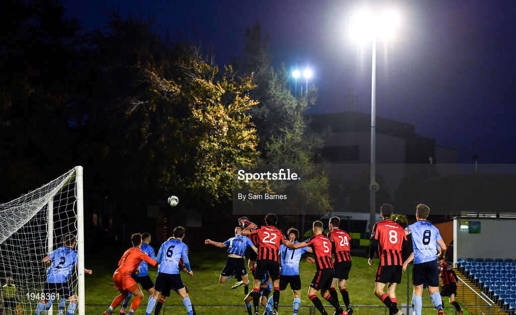 31 October 2020; Joe Gorman of Longford Town heads home his side's second goal during the SSE Airtricity League First Division Play-off Semi-Final match between UCD and Longford Town at the UCD Bowl in Belfield, Dublin. Photo by Sam Barnes/Sportsfile