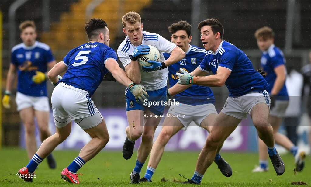 31 October 2020; Ryan McAnespie of Monaghan in action against Cavan players, from left, Gerard Smith, Stephen Smith and Killian Brady during the Ulster GAA Football Senior Championship Preliminary Round match between Monaghan and Cavan at St Tiernach’s Park in Clones, Monaghan. Photo by Stephen McCarthy/Sportsfile