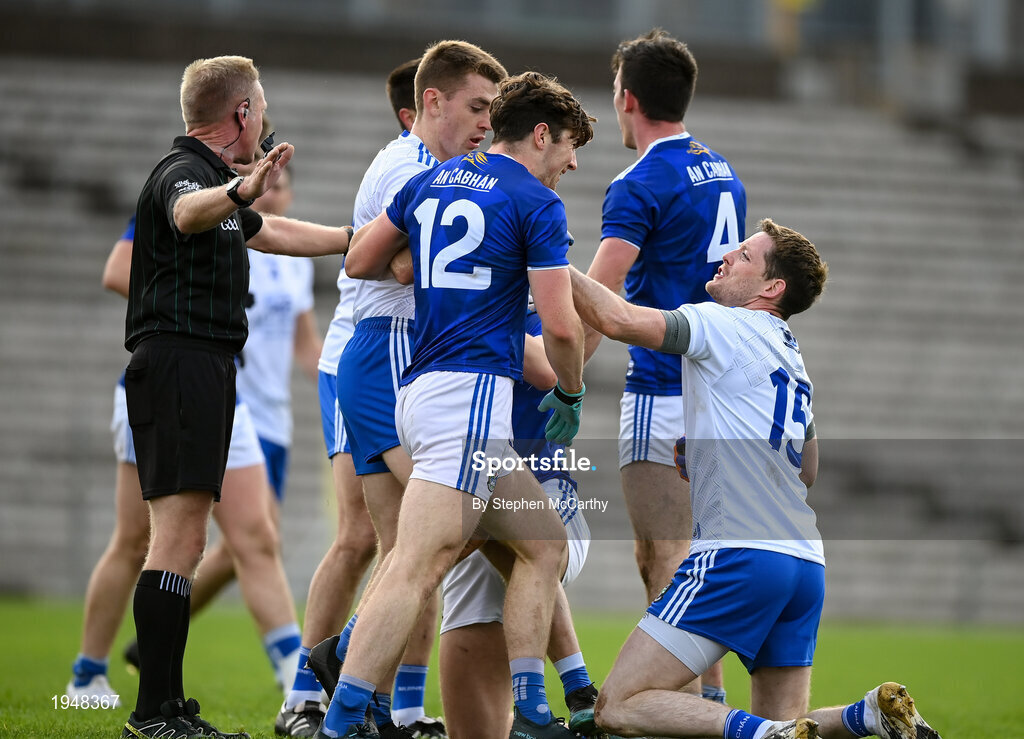 31 October 2020; Oisin Kiernan of Cavan and Conor McManus of Monaghan during the Ulster GAA Football Senior Championship Preliminary Round match between Monaghan and Cavan at St Tiernach’s Park in Clones, Monaghan. Photo by Stephen McCarthy/Sportsfile