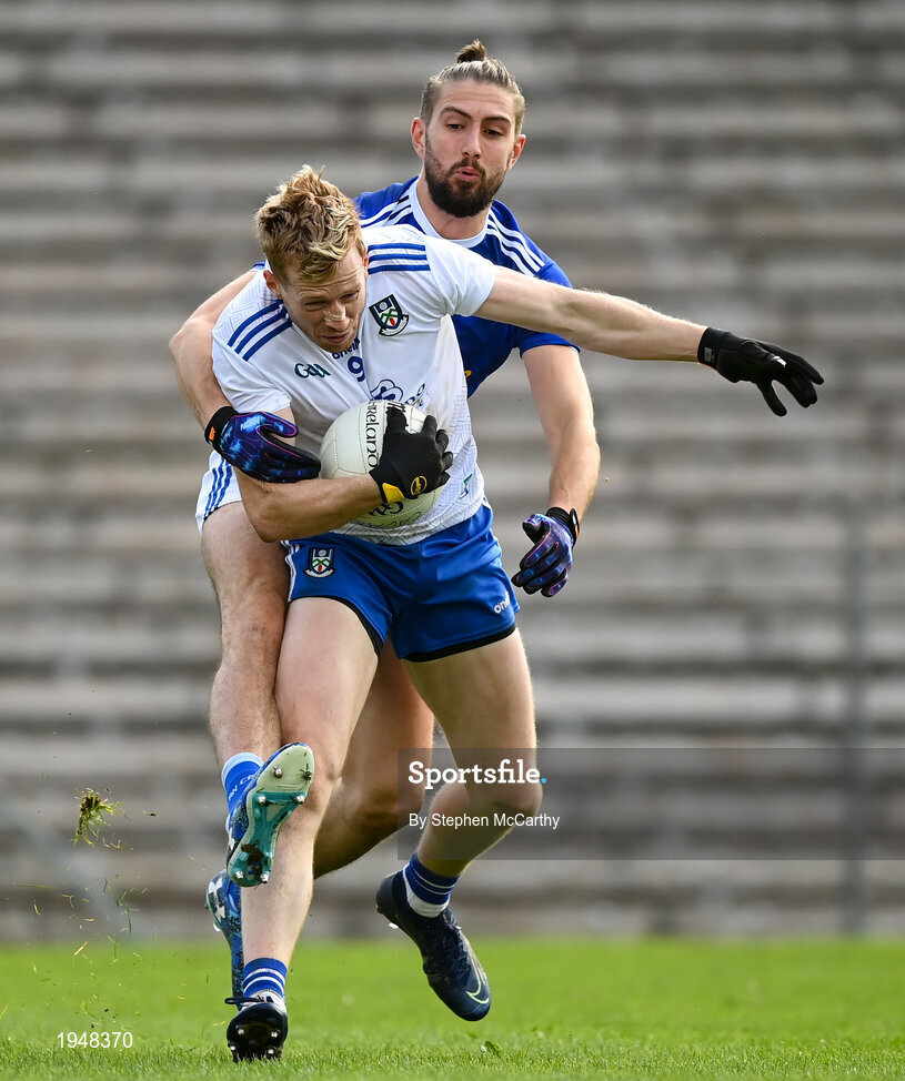 31 October 2020; Kieran Hughes of Monaghan in action against Killian Clarke of Cavan during the Ulster GAA Football Senior Championship Preliminary Round match between Monaghan and Cavan at St Tiernach’s Park in Clones, Monaghan. Photo by Stephen McCarthy/Sportsfile