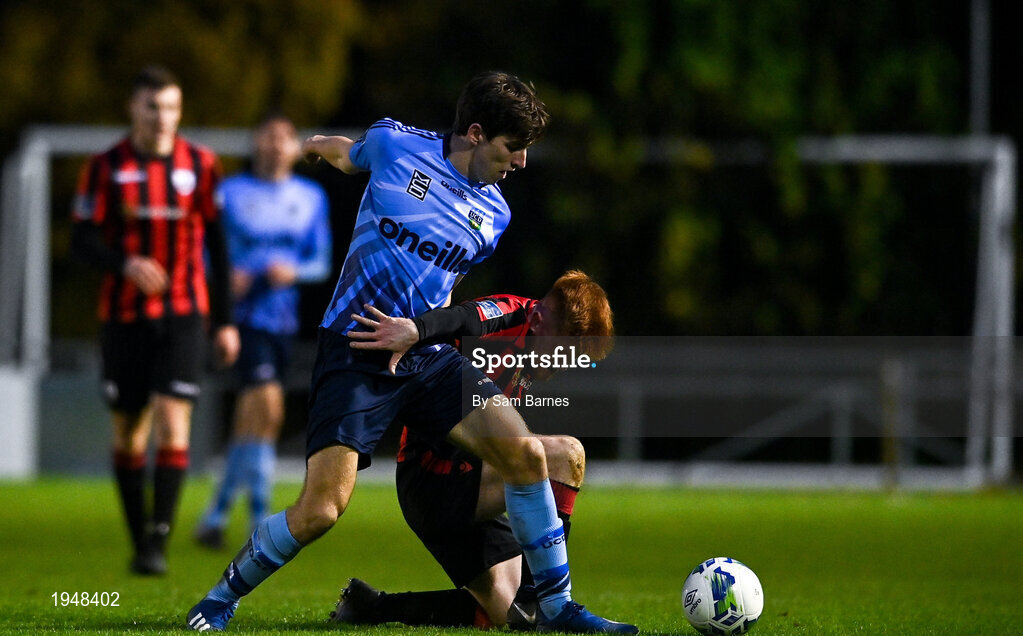 31 October 2020; Dara Keane of UCD in action against Aodh Dervin of Longford Town during the SSE Airtricity League First Division Play-off Semi-Final match between UCD and Longford Town at the UCD Bowl in Belfield, Dublin. Photo by Sam Barnes/Sportsfile