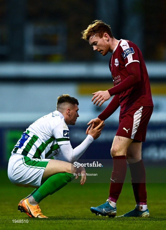 31 October 2020; Jack Lynch of Galway United with Ryan Graydon of Bray Wanderers following the SSE Airtricity League First Division Play-off Semi-Final match between Bray Wanderers and Galway United at the Carlisle Grounds in Bray, Wicklow. Photo by Eóin Noonan/Sportsfile