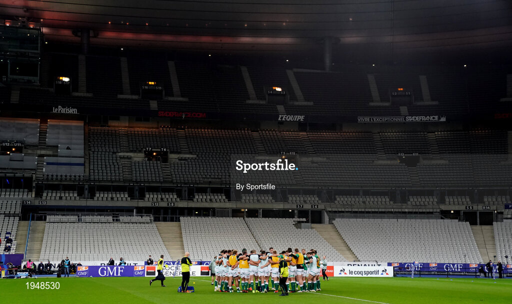 31 October 2020; The Ireland team huddle prior to the Guinness Six Nations Rugby Championship match between France and Ireland at Stade de France in Paris, France. Photo by Sportsfile