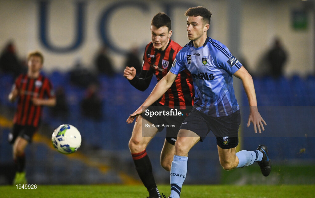 31 October 2020; Harry McEvoy of UCD in action against Callum Warfield of Longford Town during the SSE Airtricity League First Division Play-off Semi-Final match between UCD and Longford Town at the UCD Bowl in Belfield, Dublin. Photo by Sam Barnes/Sportsfile