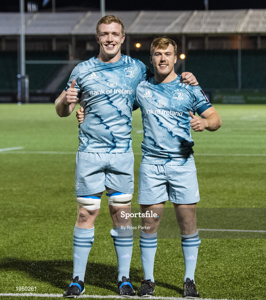 2 November 2020: Leinster's Dan Leavy, left, and debutant David Hawkshaw after the Guinness PRO14 match between Glasgow Warriors and Leinster at Scotstoun Stadium in Glasgow, Scotland. Photo by Ross Parker/Sportsfile