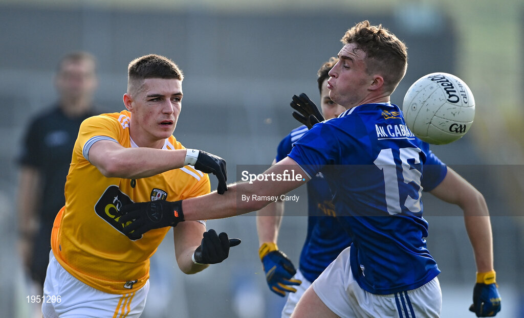 7 November 2020; James McAuley of Antrim in action against Cormac O'Reilly of Cavan during the Ulster GAA Football Senior Championship Quarter-Final match between Cavan and Antrim at Kingspan Breffni in Cavan. Photo by Ramsey Cardy/Sportsfile