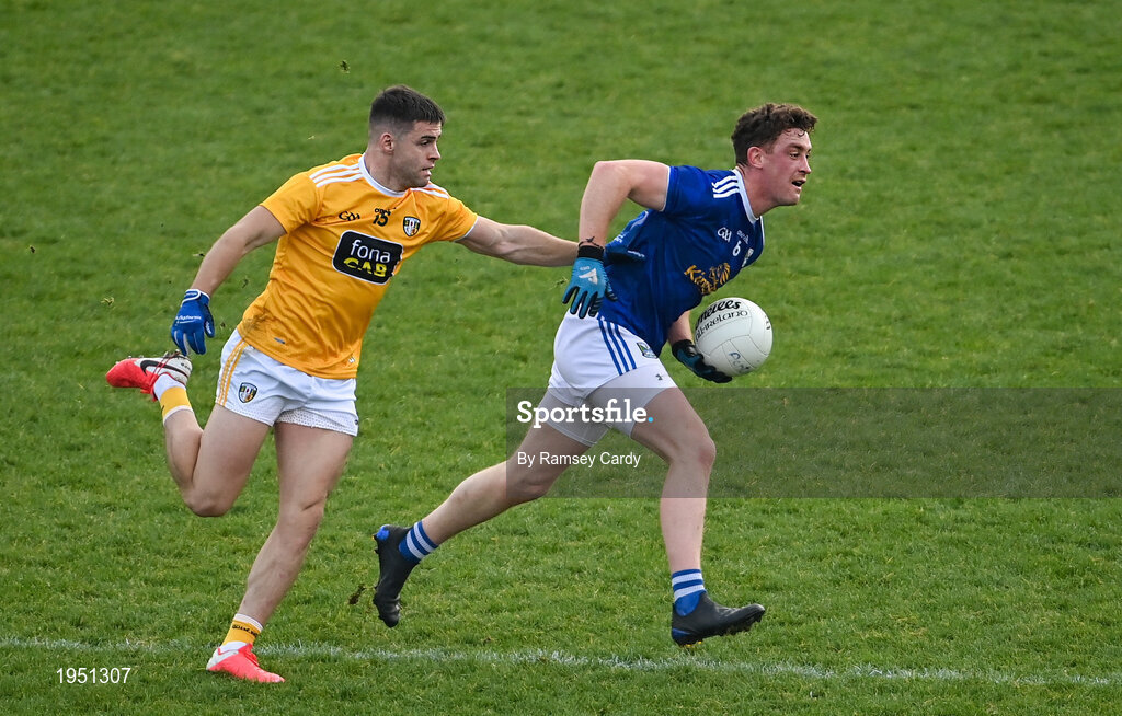 7 November 2020; Ciaran Brady of Cavan in action against Patrick McBride of Antrim during the Ulster GAA Football Senior Championship Quarter-Final match between Cavan and Antrim at Kingspan Breffni in Cavan. Photo by Ramsey Cardy/Sportsfile