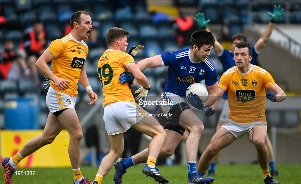 7 November 2020; Thomas Galligan of Cavan is tackled by Paddy McCormack of Antrim during the Ulster GAA Football Senior Championship Quarter-Final match between Cavan and Antrim at Kingspan Breffni in Cavan. Photo by Ramsey Cardy/Sportsfile