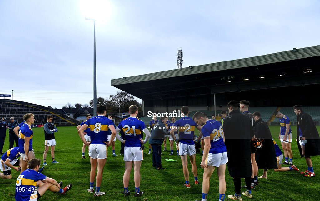 7 November 2020; Tipperary manager David Power talks to his players after the Munster GAA Football Senior Championship Semi-Final match between Limerick and Tipperary at LIT Gaelic Grounds in Limerick. Photo by Piaras Ó Mídheach/Sportsfile