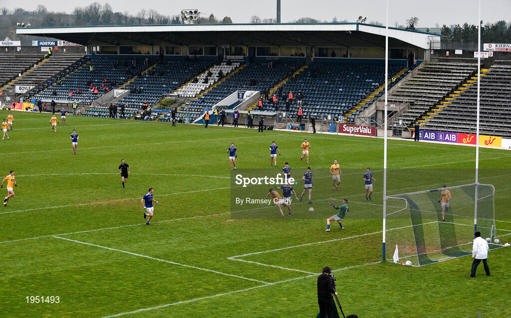 7 November 2020; Patrick Gallagher of Antrim shoots at goal during the Ulster GAA Football Senior Championship Quarter-Final match between Cavan and Antrim at Kingspan Breffni in Cavan. Photo by Ramsey Cardy/Sportsfile