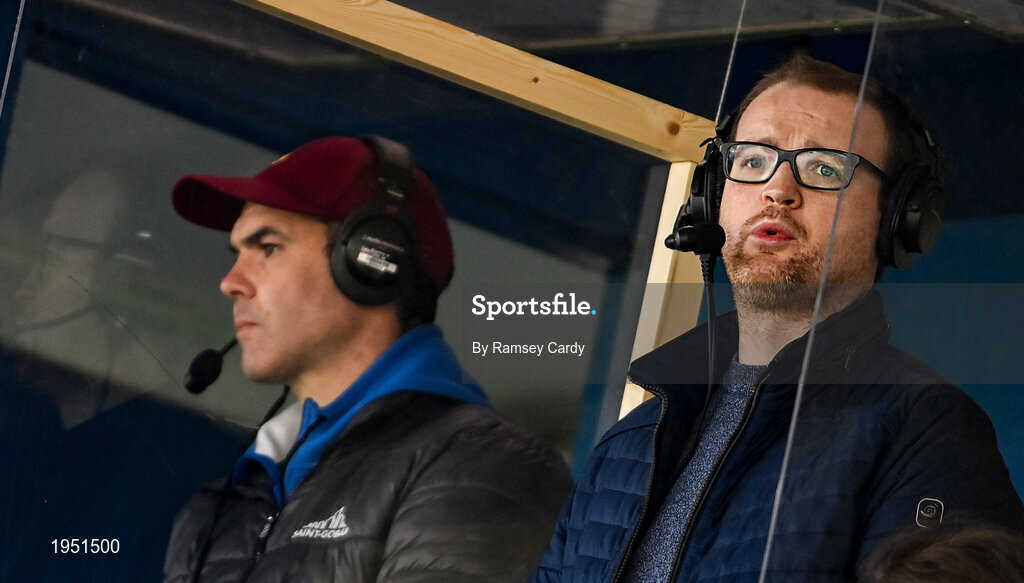 7 November 2020; BBC NI commentators Oisin Langan, right, and former Monaghan footballer Paul Finlay during the Ulster GAA Football Senior Championship Quarter-Final match between Cavan and Antrim at Kingspan Breffni in Cavan. Photo by Ramsey Cardy/Sportsfile