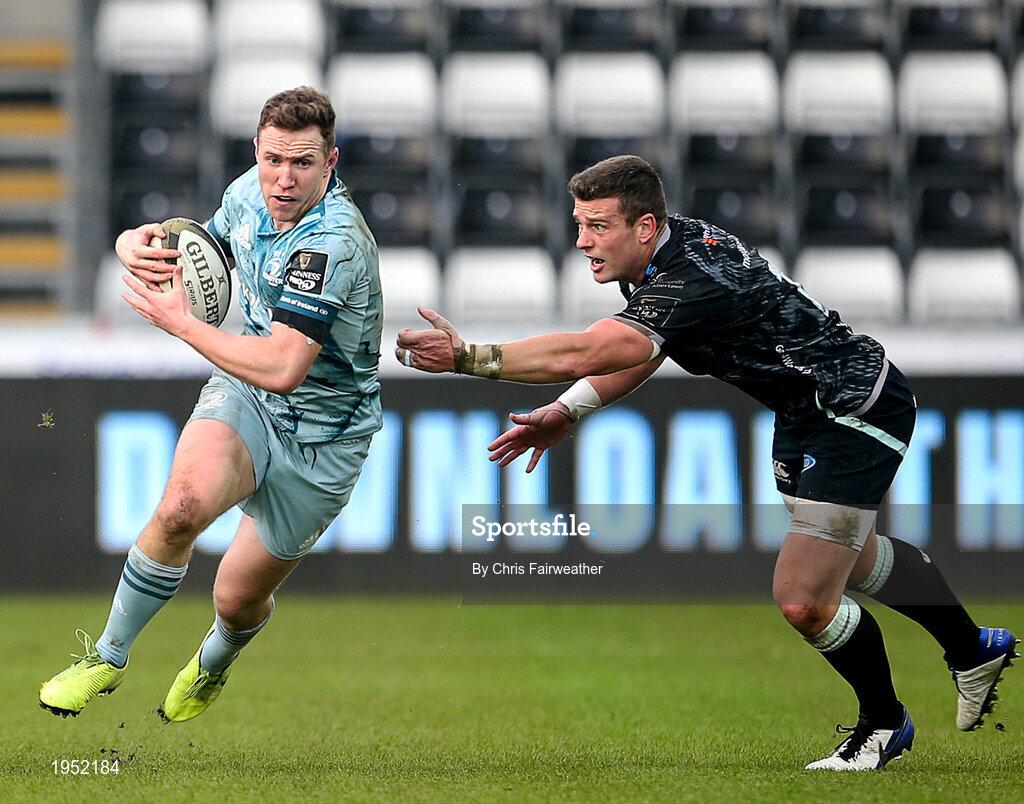 8 November 2020; Rory O'Loughlin of Leinster is challenged by Scott Williams of Ospreys during the Guinness PRO14 match between Ospreys and Leinster at Liberty Stadium in Swansea, Wales. Photo by Chris Fairweather/Sportsfile