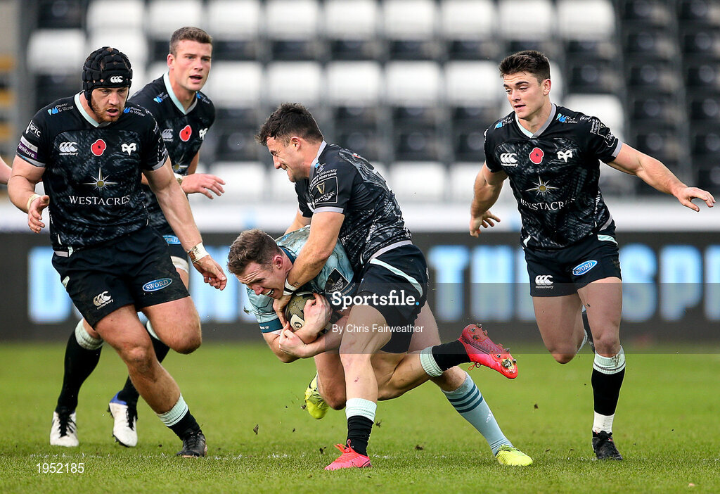 8 November 2020; Rory O'Loughlin of Leinster is tackled by Luke Morgan of Ospreys during the Guinness PRO14 match between Ospreys and Leinster at Liberty Stadium in Swansea, Wales. Photo by Chris Fairweather/Sportsfile