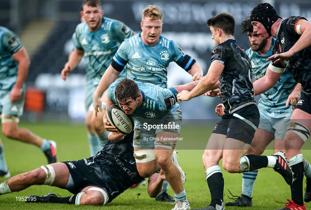 8 November 2020; Scott Penny of Leinster is tackled by Will Griffiths of Ospreys during the Guinness PRO14 match between Ospreys and Leinster at Liberty Stadium in Swansea, Wales. Photo by Chris Fairweather/Sportsfile