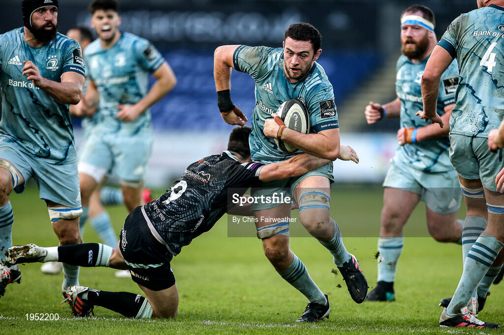 8 November 2020; Josh Murphy of Leinster is tackled by Reuben Morgan-Williams of Ospreys during the Guinness PRO14 match between Ospreys and Leinster at Liberty Stadium in Swansea, Wales. Photo by Chris Fairweather/Sportsfile
