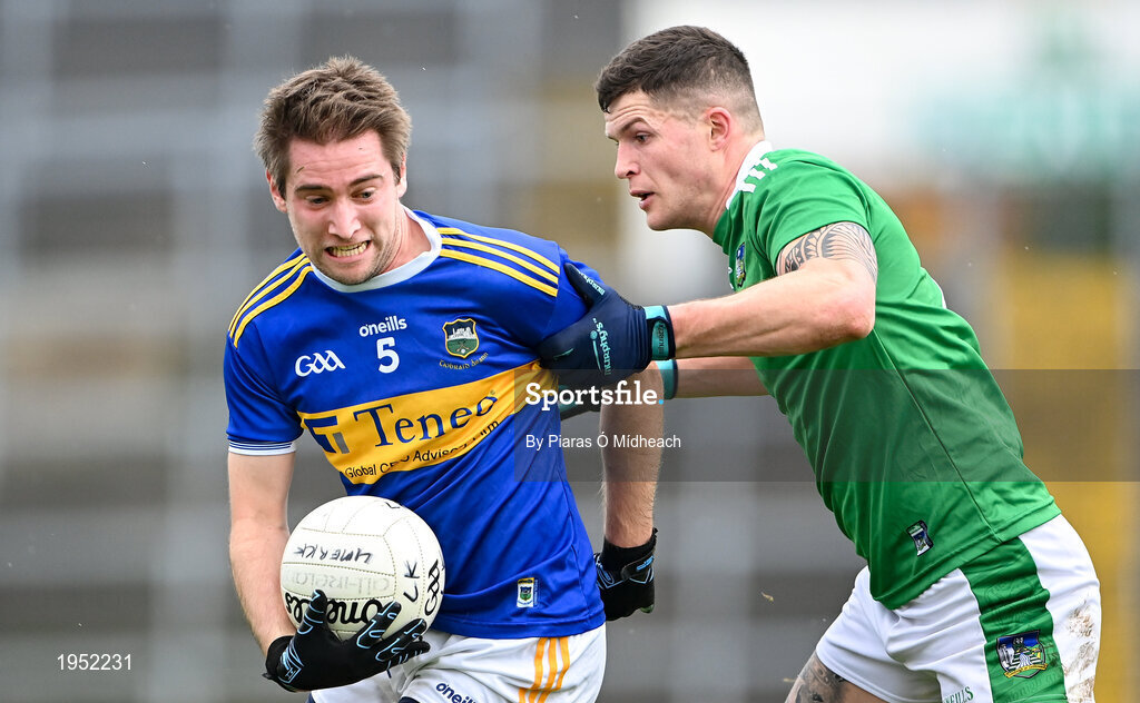 7 November 2020; Bill Maher of Tipperary in action against Iain Corbett of Limerick during the Munster GAA Football Senior Championship Semi-Final match between Limerick and Tipperary at LIT Gaelic Grounds in Limerick. Photo by Piaras Ó Mídheach/Sportsfile