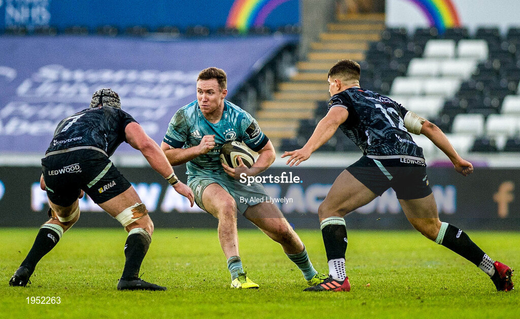 8 November 2020; Rory O'Loughlin of Leinster in action against Dan Lydiate, left, and Joe Hawkins of Ospreys during the Guinness PRO14 match between Ospreys and Leinster at Liberty Stadium in Swansea, Wales. Photo by Aled Llywelyn/Sportsfile