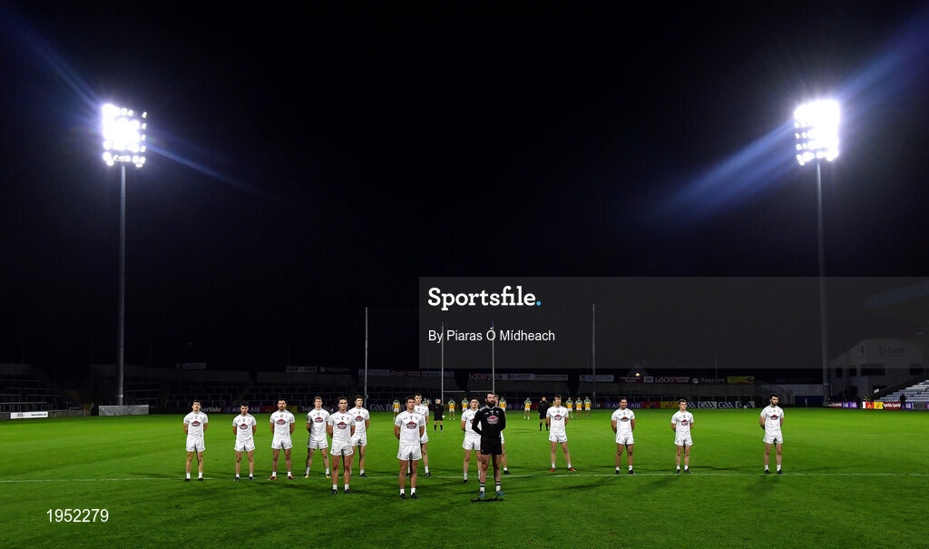 8 November 2020; Kildare players stand for Amhrán na bhFiann before the Leinster GAA Football Senior Championship Quarter-Final match between Offaly and Kildare at MW Hire O'Moore Park in Portlaoise, Laois. Photo by Piaras Ó Mídheach/Sportsfile