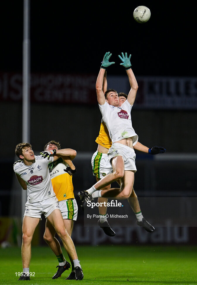 8 November 2020; Aaron Masterson of Kildare, supported by team-mate Kevin Feely, catches a kick-out ahead of Cathal Mangan and Jordan Hayes, right, of Offaly during the Leinster GAA Football Senior Championship Quarter-Final match between Offaly and Kildare at MW Hire O'Moore Park in Portlaoise, Laois. Photo by Piaras Ó Mídheach/Sportsfile