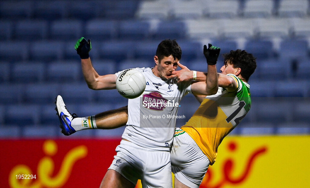 8 November 2020; Shea Ryan of Kildare is tackled by Niall McNamee of Offaly during the Leinster GAA Football Senior Championship Quarter-Final match between Offaly and Kildare at MW Hire O'Moore Park in Portlaoise, Laois. Photo by Piaras Ó Mídheach/Sportsfile