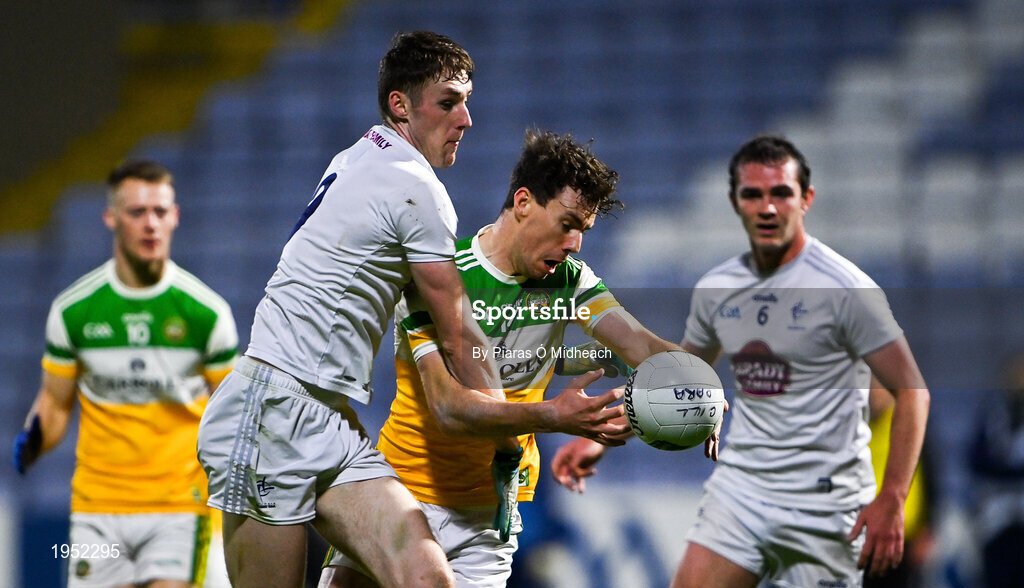 8 November 2020; Niall McNamee of Offaly is tackled by Aaron Masterson of Kildare during the Leinster GAA Football Senior Championship Quarter-Final match between Offaly and Kildare at MW Hire O'Moore Park in Portlaoise, Laois. Photo by Piaras Ó Mídheach/Sportsfile