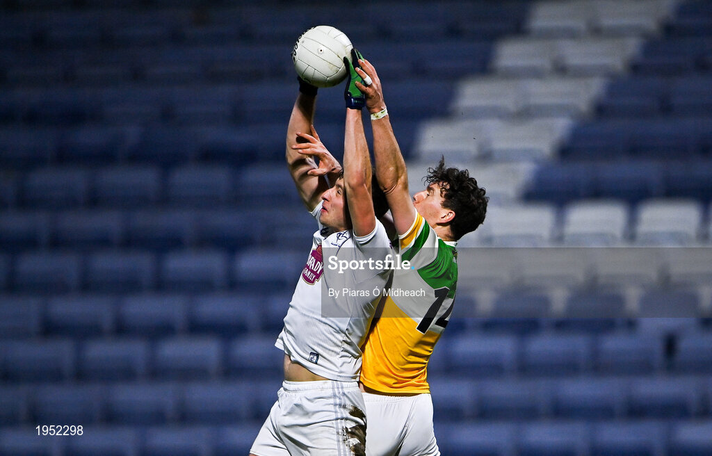 8 November 2020; Niall McNamee of Offaly is tackled by Shea Ryan of Kildare during the Leinster GAA Football Senior Championship Quarter-Final match between Offaly and Kildare at MW Hire O'Moore Park in Portlaoise, Laois. Photo by Piaras Ó Mídheach/Sportsfile
