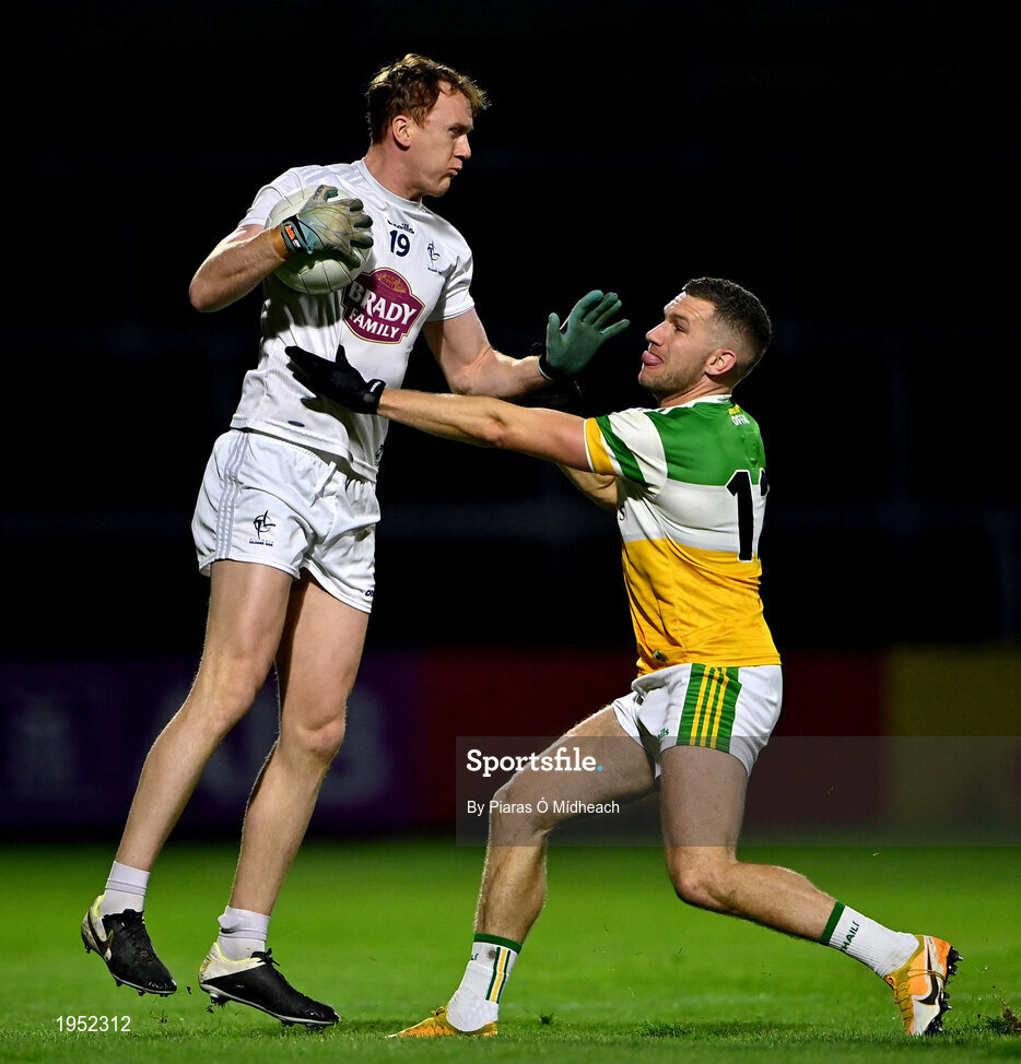 8 November 2020; Paul Cribbin of Kildare in action against Anton Sullivan of Offaly during the Leinster GAA Football Senior Championship Quarter-Final match between Offaly and Kildare at MW Hire O'Moore Park in Portlaoise, Laois. Photo by Piaras Ó Mídheach/Sportsfile