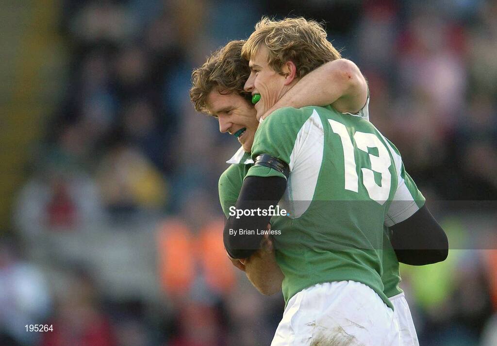 26 November 2005; Andrew Trimble (13), Ireland, celebrates with team-mate Gordon D'Arcy after scoring his sides first try. permanent tsb International Friendly 2005-2006, Ireland v Romania, Lansdowne Road, Dublin. Picture credit: Brian Lawless / SPORTSFILE
