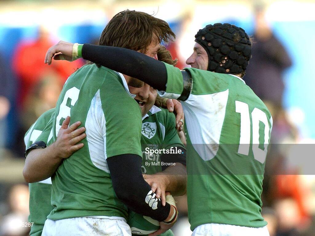 26 November 2005; Neil Best, Ireland, 6, is congratulated by David Humphreys and Shane Byrne after scoring his try. permanent tsb International Friendly 2005-2006, Ireland v Romania, Lansdowne Road, Dublin. Picture credit: Matt Browne / SPORTSFILE