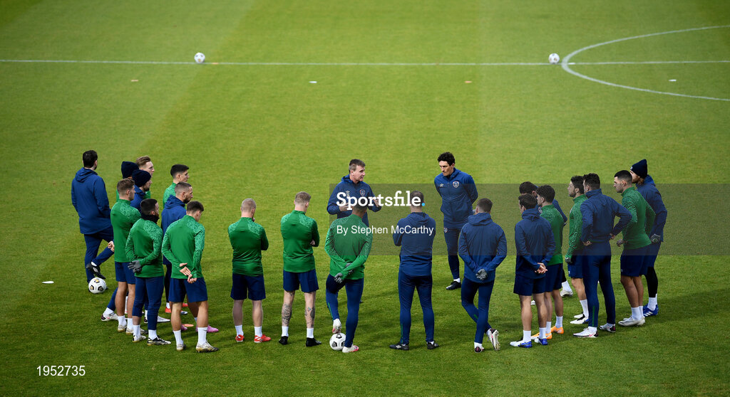 9 November 2020; Manager Stephen Kenny speaks to his players during a Republic of Ireland training session at The Hive in Barnet, England. Photo by Stephen McCarthy/Sportsfile