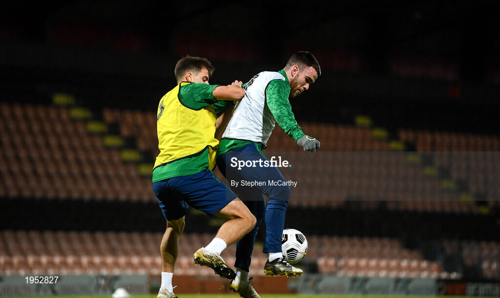 9 November 2020; Aaron Connolly is tackled by Jayson Molumby, left, during a Republic of Ireland training session at The Hive in Barnet, England. Photo by Stephen McCarthy/Sportsfile