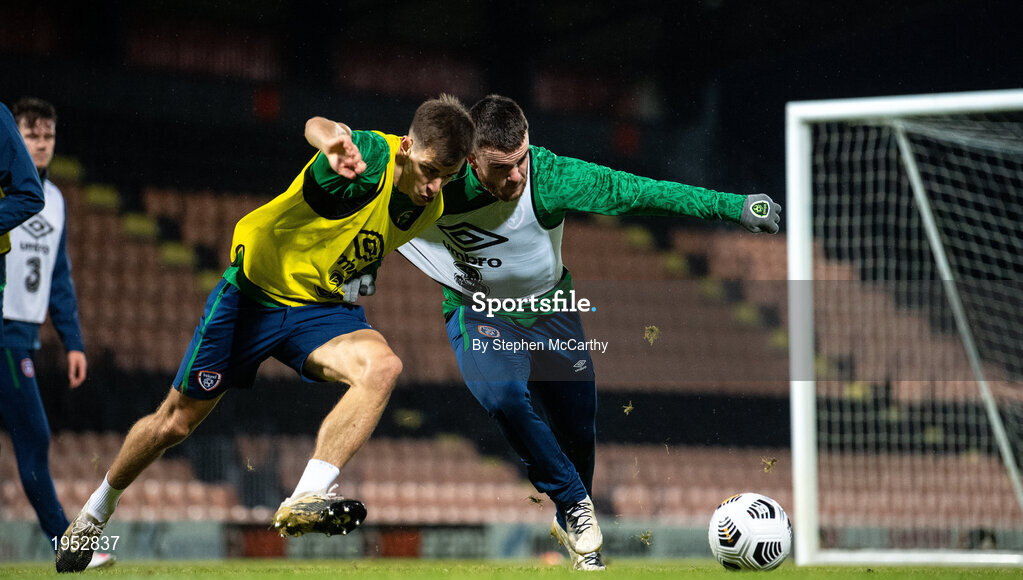 9 November 2020; Jayson Molumby and Aaron Connolly, right, during a Republic of Ireland training session at The Hive in Barnet, England. Photo by Stephen McCarthy/Sportsfile
