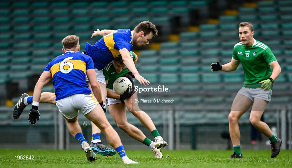 7 November 2020; Gordon Brown of Limerick, supported by team-mate Hugh Bourke, right, in action against Liam Casey and Kevin Fahey, 6, of Tipperary during the Munster GAA Football Senior Championship Semi-Final match between Limerick and Tipperary at LIT Gaelic Grounds in Limerick. Photo by Piaras Ó Mídheach/Sportsfile